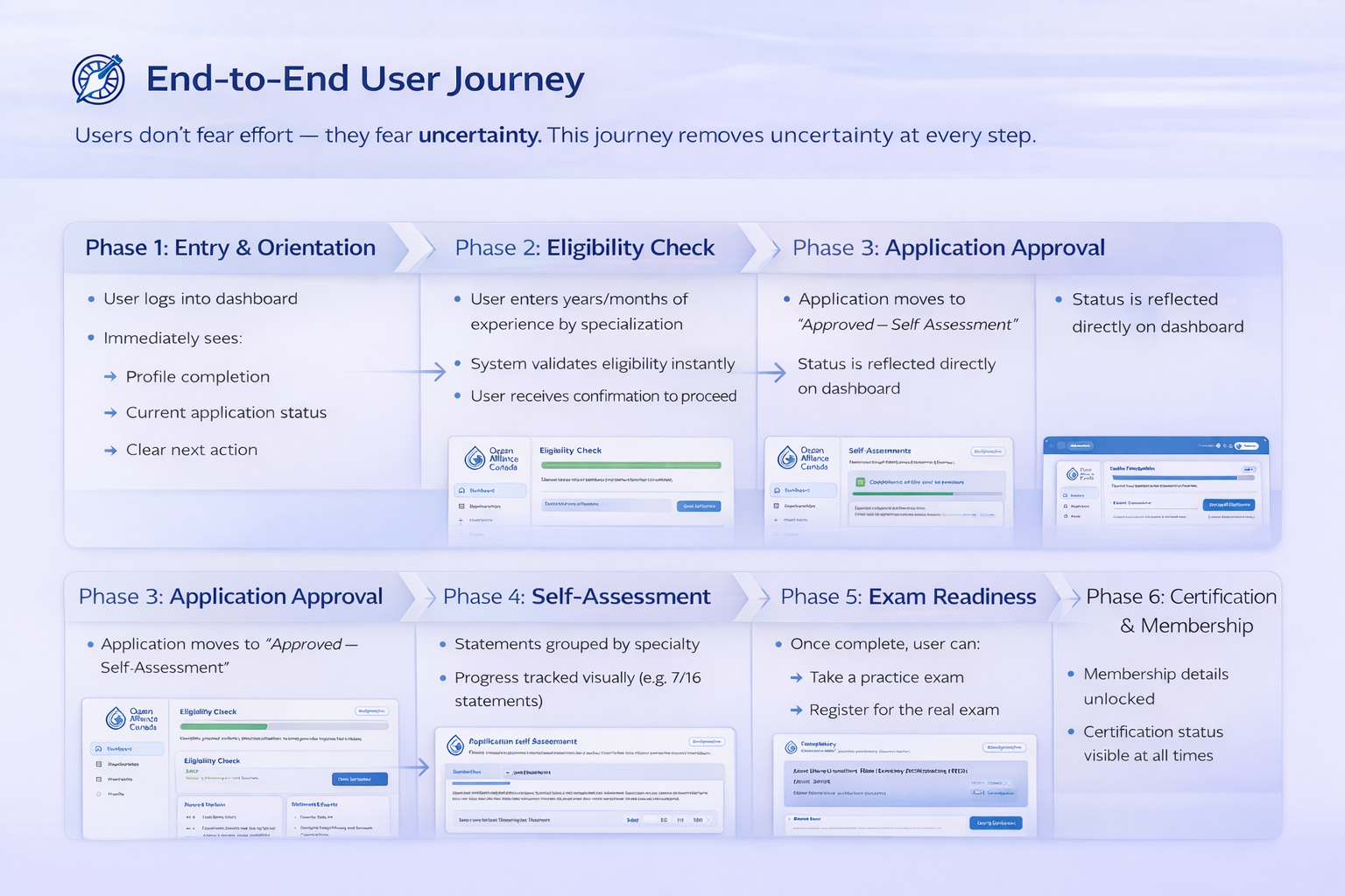 I joined the project to help design and build a single, scalable digital portal that could support this entire journey while remaining clear, accessible, and trustworthy for users navigating a high-stakes certification.