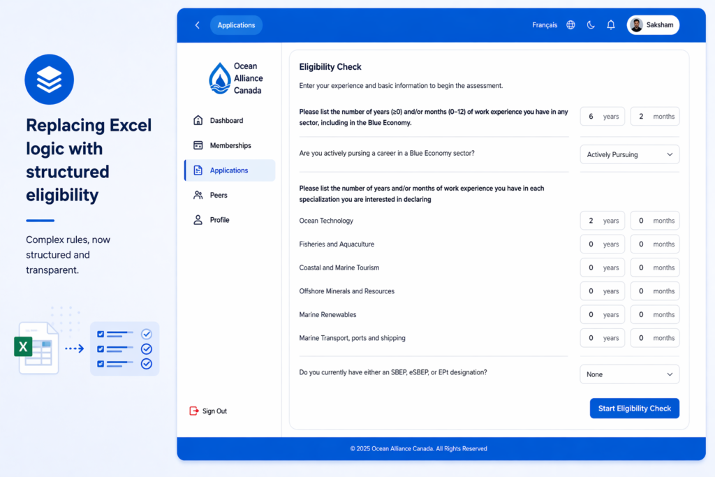 Eligibility was being managed through Excel sheets with macros, where conditional logic helped determine whether an applicant qualified for the next stage. While this made the process operationally possible, it also meant that much of the system’s logic lived in a place users could not see or understand. For applicants, decisions could feel opaque. For administrators, maintaining and scaling the process required continuous manual effort.