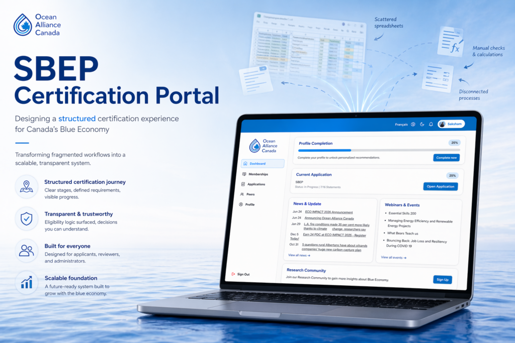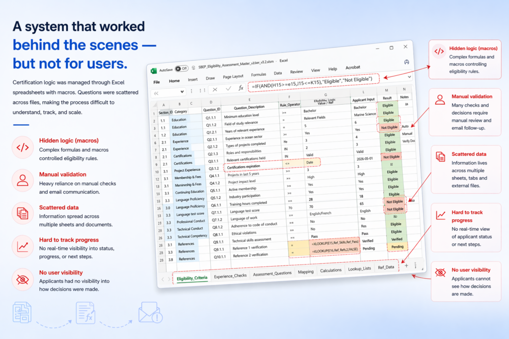 The SBEP Certification Portal was designed to improve how professionals apply for and progress through certification within the Blue Economy. At the time, the process was functioning operationally, but it was held together through manual workarounds, spreadsheet logic, and disconnected evaluation steps.