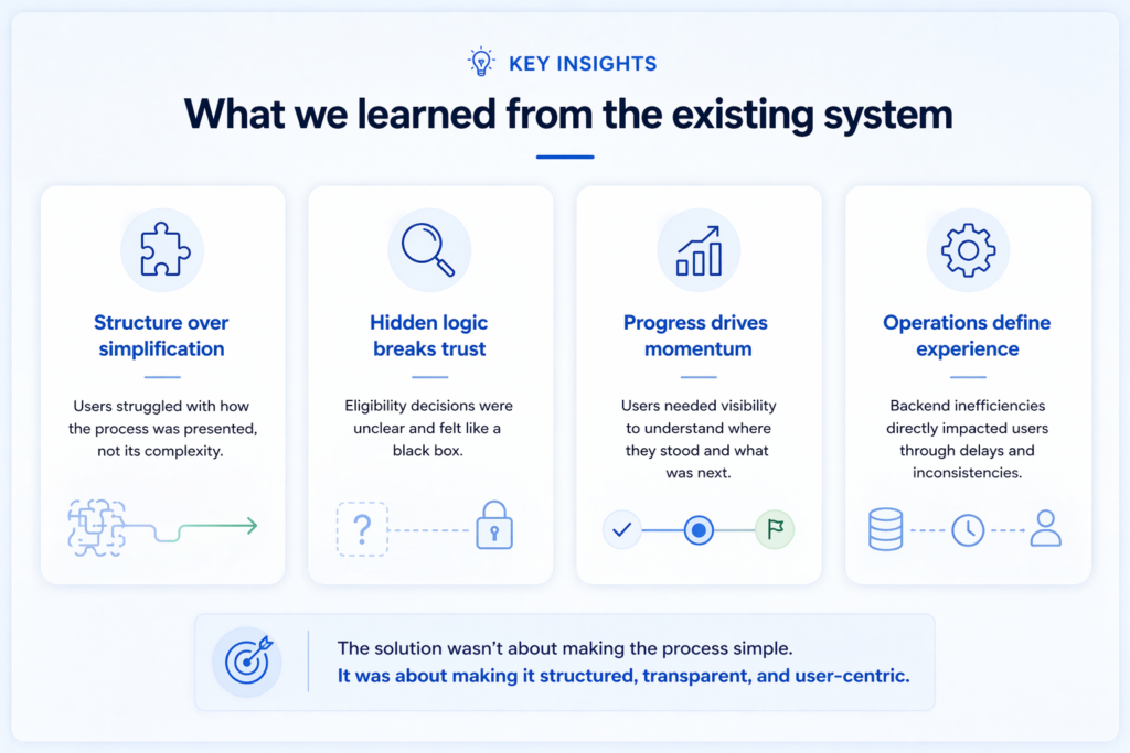 Many of the problems visible to applicants were actually symptoms of backend inefficiency. Manual validation, scattered question sets, and unclear stage definitions all increased the workload for administrators, which in turn created delays, ambiguity, and inconsistency for users.